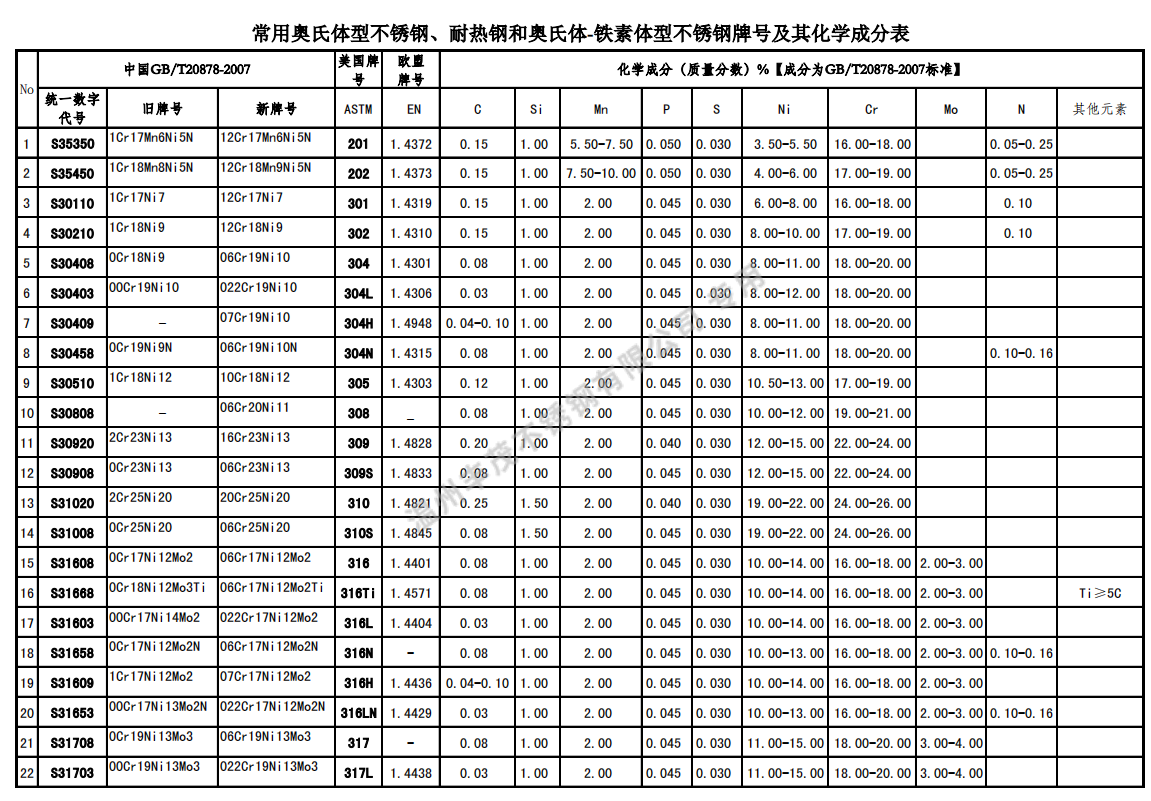 常用不锈钢牌号最新国家标准化学成分表