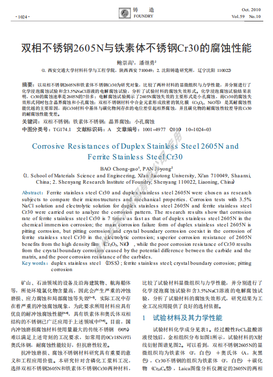 双相不锈钢2605N与铁素体不锈钢Cr30的腐蚀性能