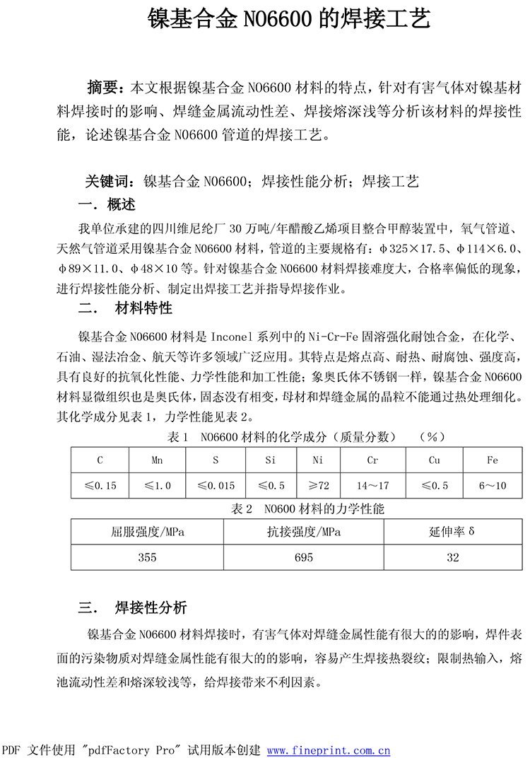 镍基合金N06600的焊接工艺
