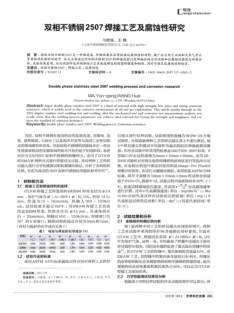 > 公司新闻 > 双相不锈钢2507焊接工艺及腐蚀性研究